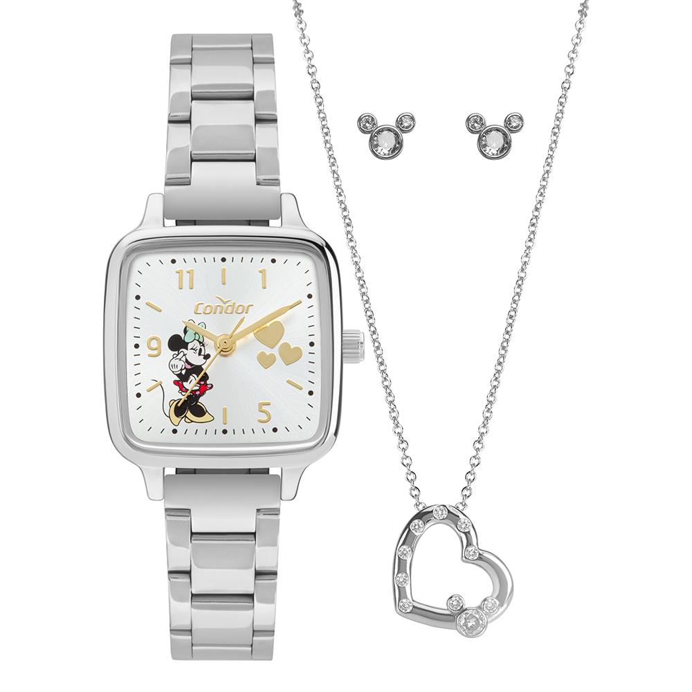 O kit acompanha um colar com pingente em formato de coração cravejado com cristais e um par de brincos inspirados nas orelhas da Minnie, completando o visual com um toque romântico e jovial. Além disso, o relógio possui resistência à água de até 50 metros, combinando beleza e funcionalidade.