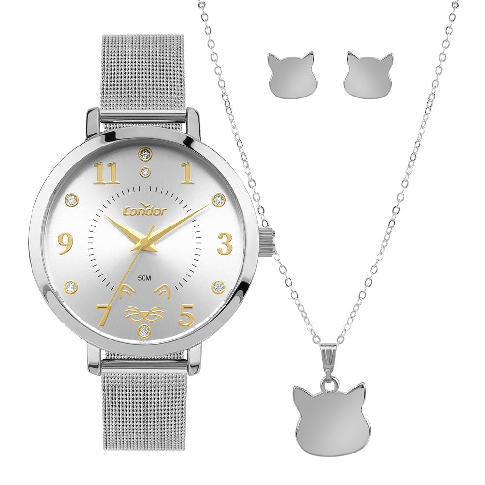 O Kit Condor Feminino Mimos E Sutilezas Prata é a escolha ideal para quem valoriza o charme nos detalhes. Com caixa de 38 mm em metal prateado e pulseira de aço tipo mesh, o relógio combina elegância e conforto. Seu mostrador prateado traz um detalhe lúdico na posição das 6 horas: um discreto desenho de rosto de gatinho, acompanhado por marcadores com cristais e algarismos dourados, criando um contraste delicado e sofisticado.