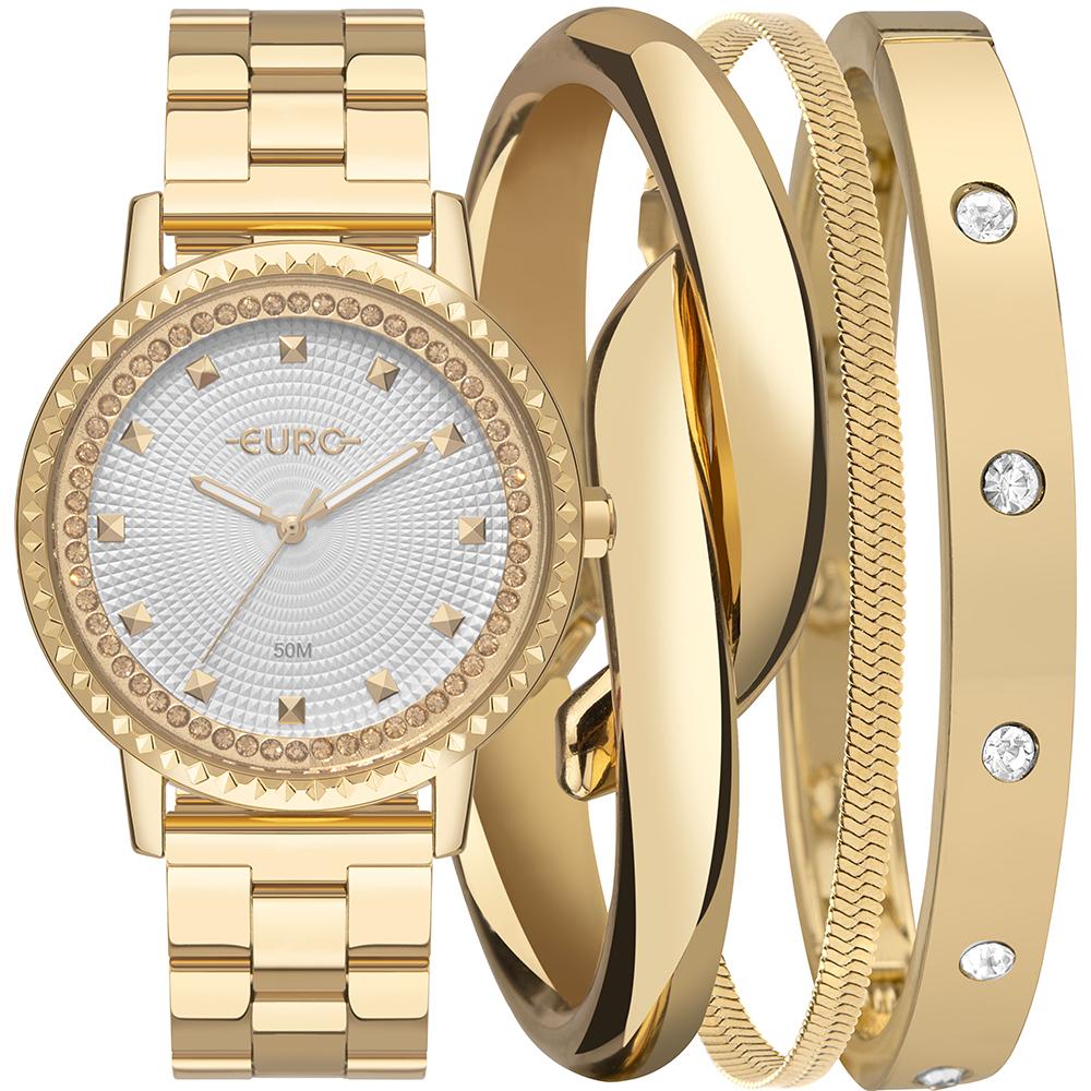O Kit Euro Feminino Soul Dourado - EU2036YVL/K4K é a escolha certa para quem busca um conjunto impactante, elegante e cheio de brilho. Com visual luxuoso e moderno, o relógio e as três pulseiras que acompanham o kit formam uma composição sofisticada, ideal para transformar qualquer look com estilo.
