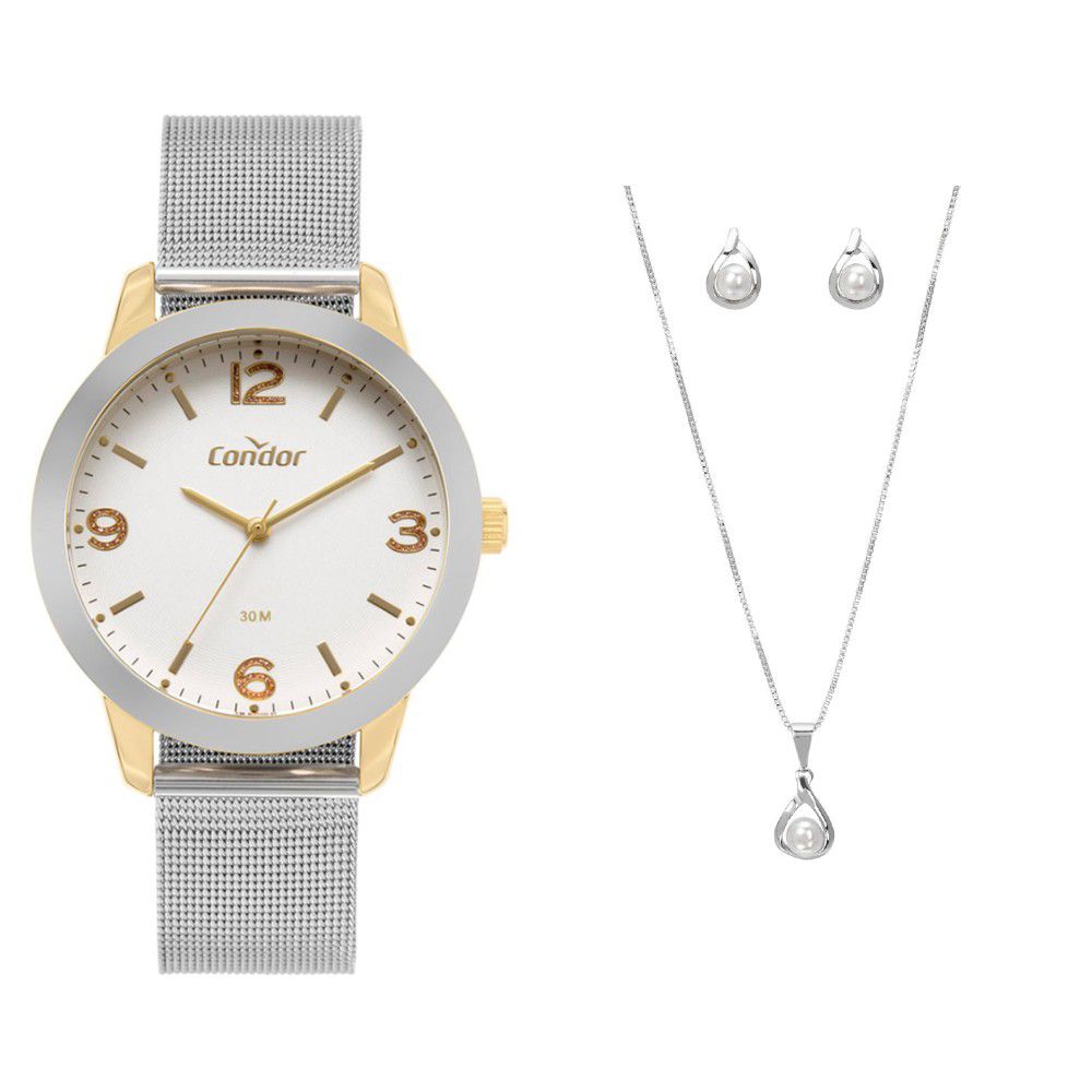 O relógio feminino bicolor Condor tem detalhes encantadores. Com um estilo romântico moderno, o modelo tem mostrador prateado com marcadores de hora em dourado e detalhes em glitter para brilhar ainda mais. Sua pulseira é tipo mesh feita em aço e possui resistência à água de até 3 ATM.