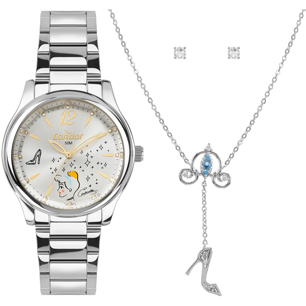 O relógio possui caixa redonda em aço prateado e mostrador claro com detalhes temáticos inspirados na personagem Cinderela, além de pequenos cristais aplicados que acrescentam brilho sutil e refinado. Os ponteiros e índices em tom dourado criam um contraste elegante, garantindo ótima leitura e valorizando o design do mostrador.