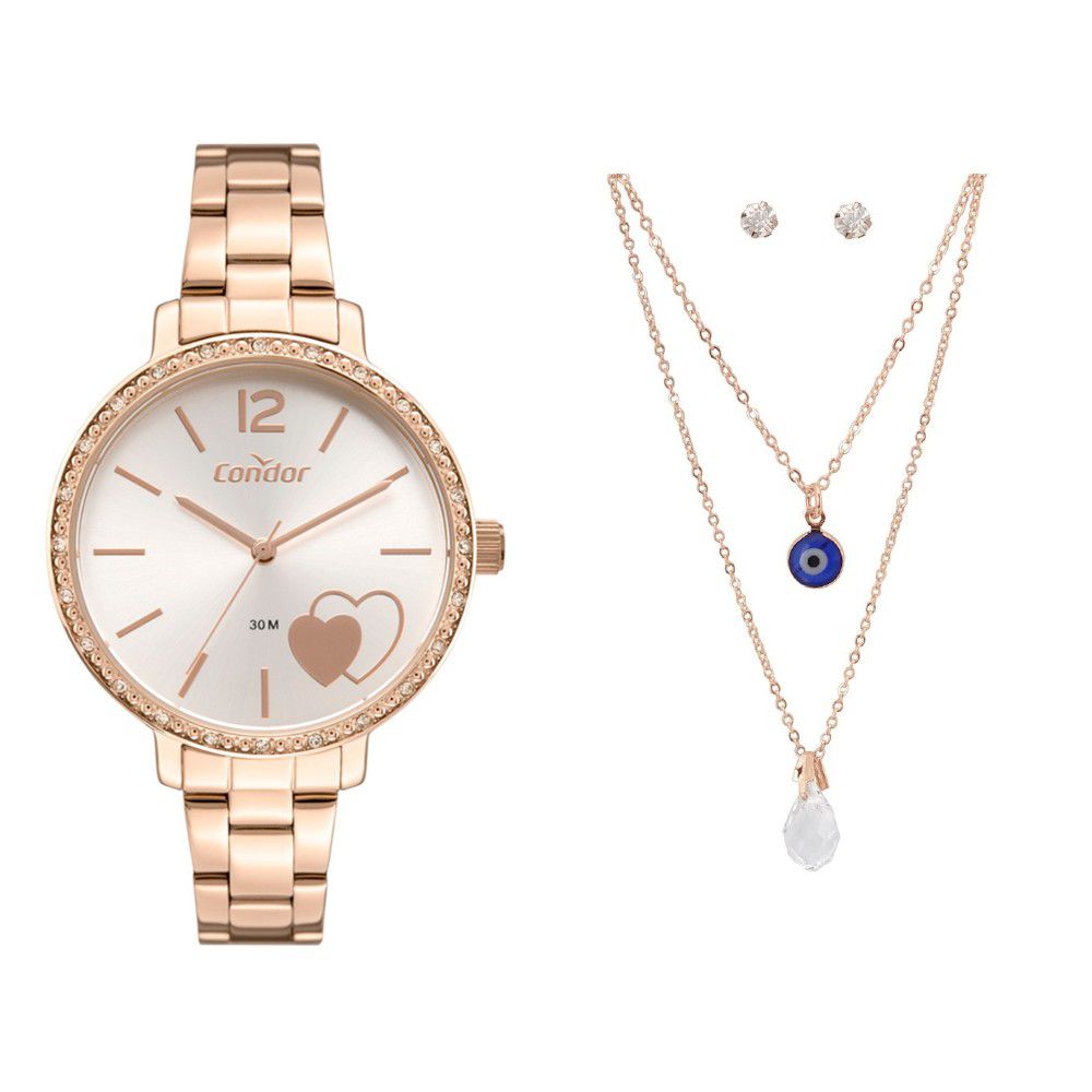 O relógio feminino rosé Condor é um modelo com pedras cravejadas no aro externo e corações desenhados no mostrador. O coração representa amor, carinho e atenção, ideal para representar o seu estilo romântico. O kit ainda acompanha uma bela semi joia para completar o look. O modelo possui pulseira feita em aço e resistência à água de até 3 ATM.