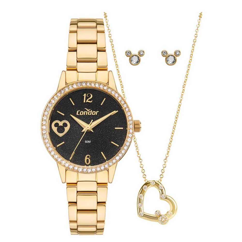 O Kit Condor Feminino Elegante Dourado CO2035NTB/K4P é um tributo à magia e ao encanto da Disney. Este modelo temático traz o icônico Mickey Mouse de forma delicada e sofisticada: sua silhueta aparece como detalhe no mostrador do relógio, com um fundo preto cintilante que realça o design encantador.