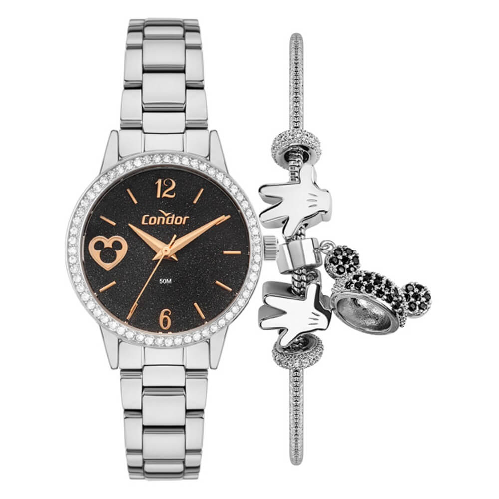 O Kit Condor Feminino Elegante Prata CO2035NTC/K4P é uma homenagem charmosa ao universo Disney, ideal para quem ama o clássico Mickey Mouse. Este modelo temático traz a silhueta do Mickey gravada no mostrador preto com brilho, e é acompanhado por uma pulseira prata com berloques exclusivos, incluindo as icônicas mãos, o rosto e a silhueta do personagem.