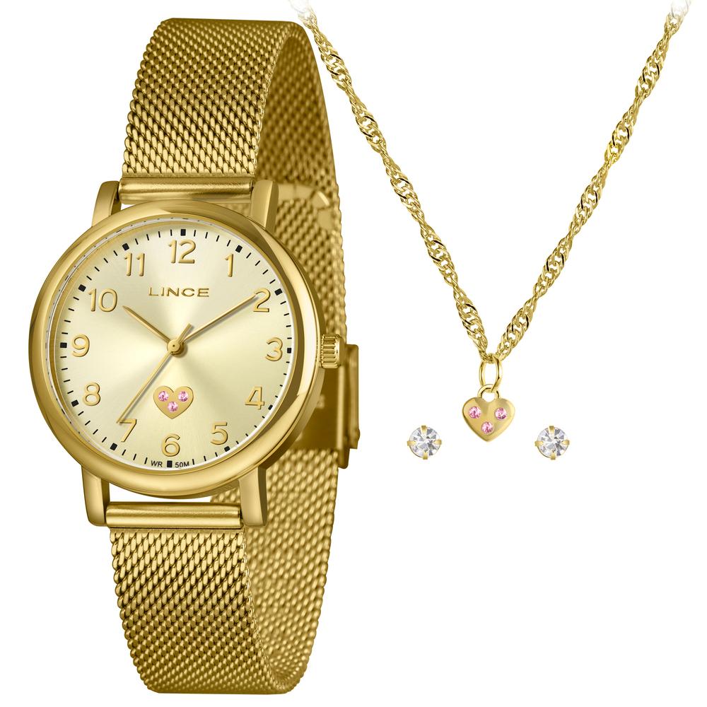 A pulseira mesh em aço dourado traz conforto e um visual contemporâneo, enquanto o mecanismo analógico em quartz assegura precisão no uso diário. O kit acompanha colar e brincos, compondo um conjunto completo que valoriza ainda mais a proposta do modelo.