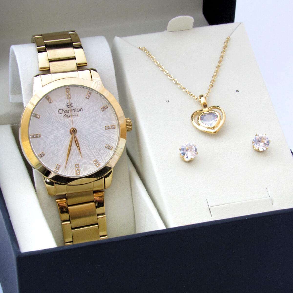 O relógio acompanha um conjunto com colar e brincos, tornando-o uma excelente opção para presente. Os modelos dos acessórios podem variar de acordo com o lote, sendo a imagem meramente ilustrativa.