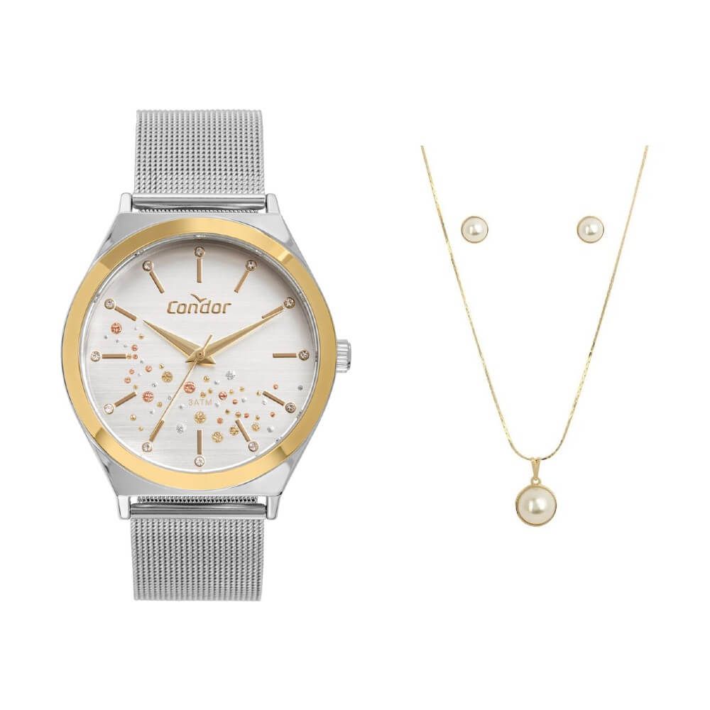 O relógio feminino prateado Condor combina com a rotina acelerada do dia a dia. Sua aplicação de glitter no mostrador e pulseira de aço tipo mesh deixarão seu look feminino e muito charmoso. Ele ainda apresenta marcadores de hora com pedras e aro externo em dourado, que fazem um lindo contraste com o modelo. Possui resistência à água de 3 ATM e tamanho da caixa 41mm.