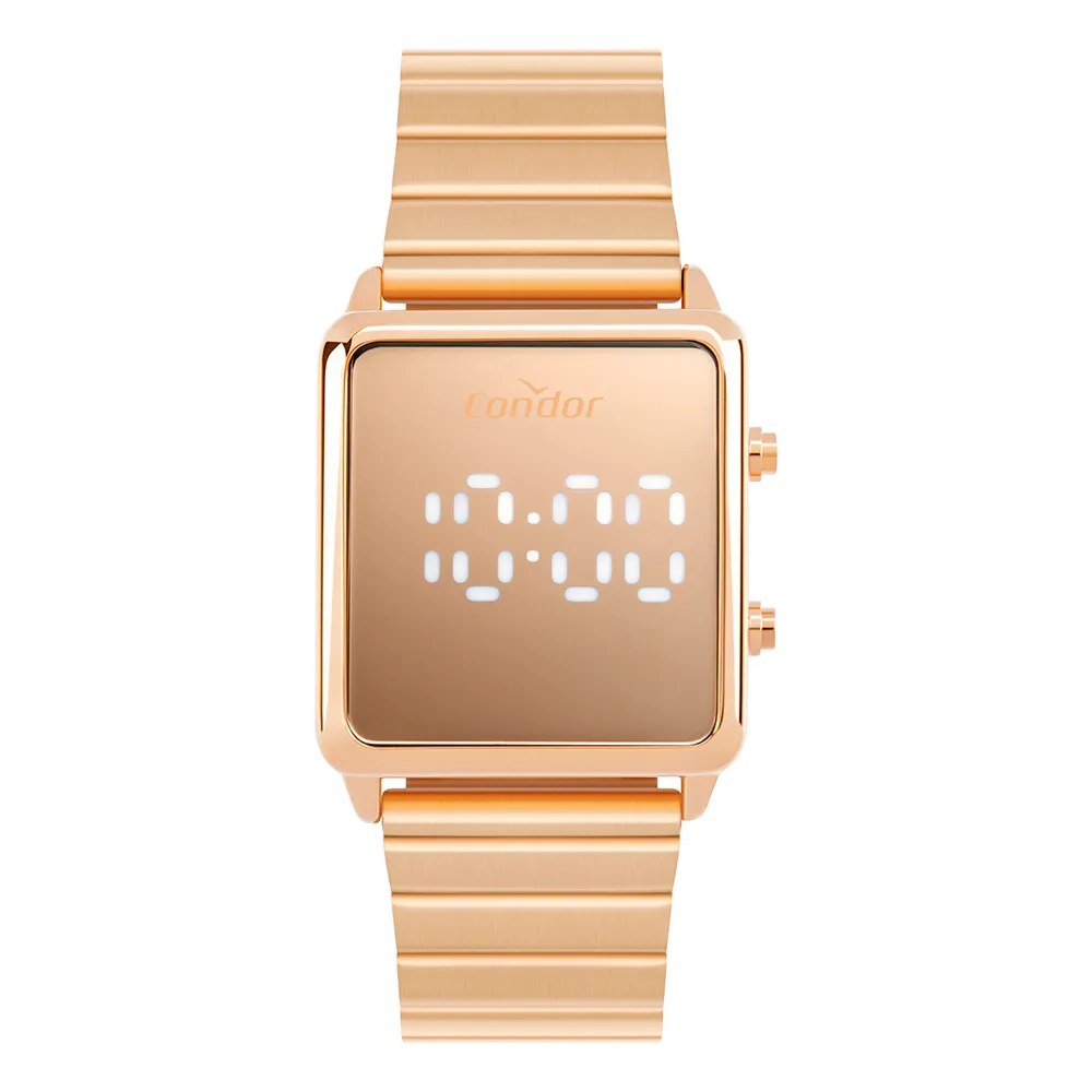 Com caixa de 34,5 mm em metal e pulseira em aço inoxidável rosé, o modelo apresenta mostrador espelhado com display digital em LED branco, que acende apenas quando ativado, proporcionando um visual limpo e contemporâneo.