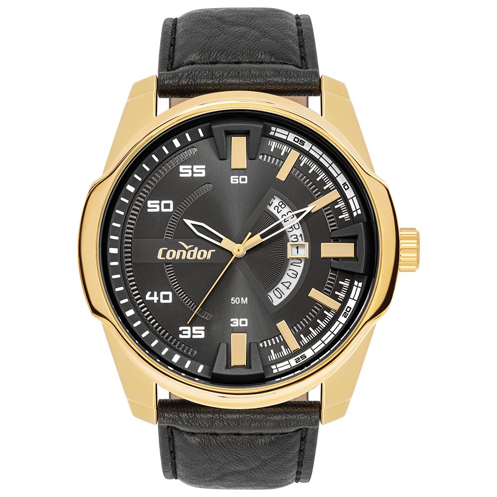 A pulseira de couro preto garante conforto e elegância, enquanto a caixa metálica dourada de 50 mm confere imponência ao pulso. O mostrador conta com marcadores bem definidos e visor de calendário diário, combinando funcionalidade e design.