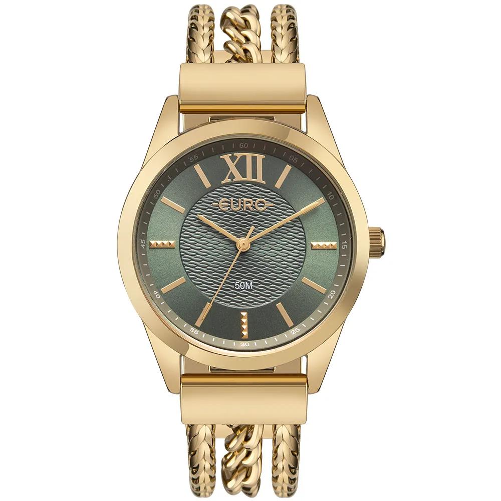 O Relógio Euro Feminino Chains Dourado é a escolha ideal para quem busca um visual marcante, moderno e cheio de personalidade. Com design inspirado em acessórios contemporâneos, este modelo se destaca pela pulseira com elos em formato de correntes, que transforma o relógio em um verdadeiro elemento de estilo no pulso feminino.