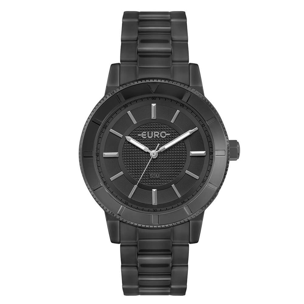 A coleção Boyfriend da Euro apresenta um relógio grafite robusto e marcante com tendência esportiva e casual. Perfeito para uma mulher poderosa vestir de dia ou de noite. Tamanho de caixa: 42 mm.