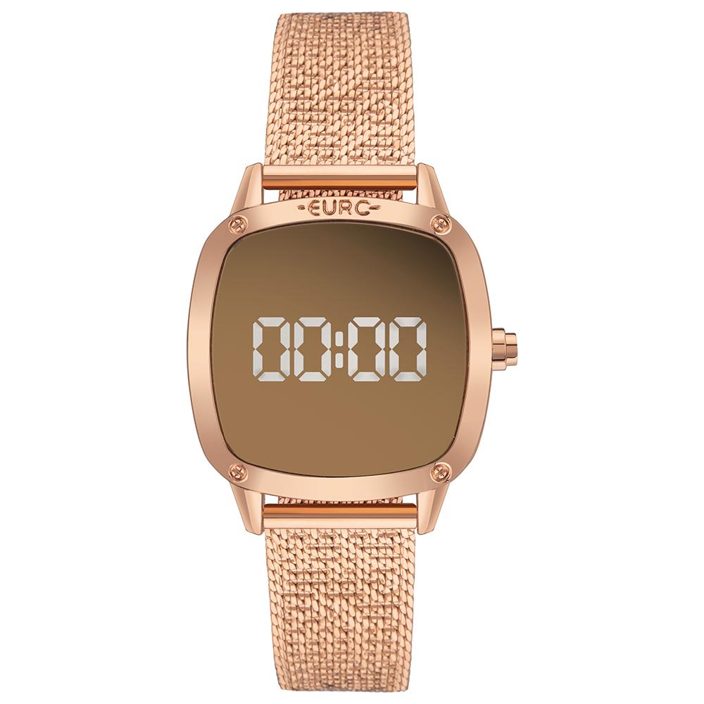 Seu mostrador digital espelhado com superfície lisa e elegante revela as horas de forma sutil, apenas quando acionado, criando um efeito surpreendente e moderno. A caixa quadrada com cantos suavizados e o acabamento em rosé polido conferem elegância e versatilidade, enquanto a pulseira metálica em malha rosé brilhante garante conforto e um encaixe perfeito no pulso.