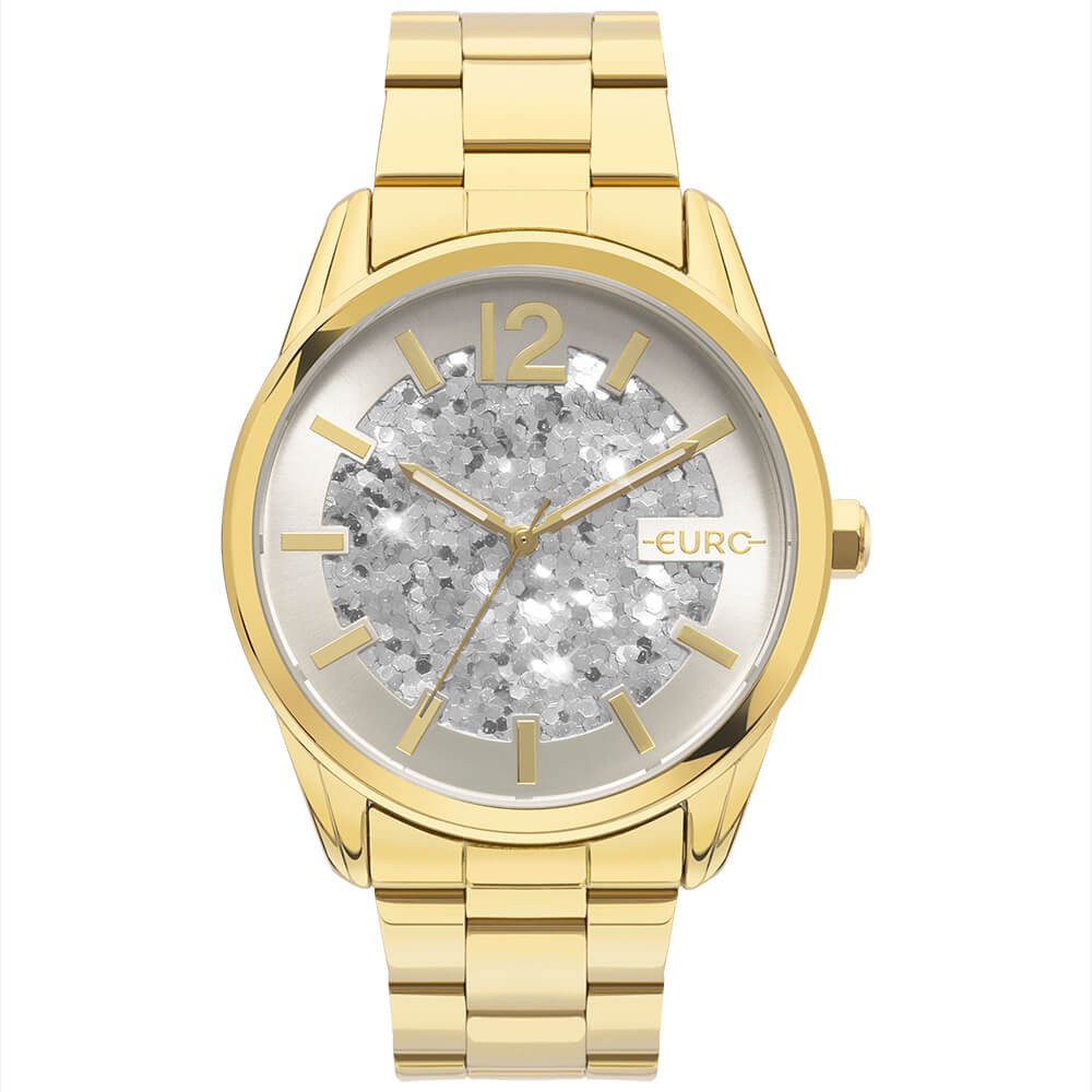É hora de brilhar! Puro Glamour é um modelo elegante e sofisticado, o paetê apresenta uma aplicação de brilho diferenciada no centro do mostrador. Discreto e ao mesmo tempo ousado, ele complementa perfeitamente o aro interno e celebra a sofisticação da mulher Euro. O relógio feminino dourado possui um design atemporal com um toque moderno e mostrador prata com fundo de paetês e aro interno metalizado.