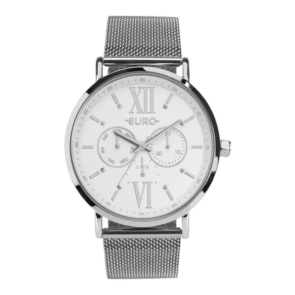 O Relógio Euro Multiglow Feminino na cor prata oferece um visual moderno e funcional em uma peça que transita facilmente entre o casual e o sofisticado. Seu design minimalista com mostrador branco e pulseira mesh traz leveza e elegância para o pulso.