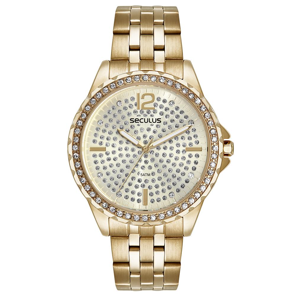 O relógio feminino Seculus 44238LPSVDS1 é uma peça que une sofisticação e funcionalidade, ideal para mulheres que apreciam acessórios marcantes. Com design moderno e acabamento dourado, destaca-se pelo mostrador preenchido com cristais e catraca também adornada, proporcionando um brilho único ao pulso.