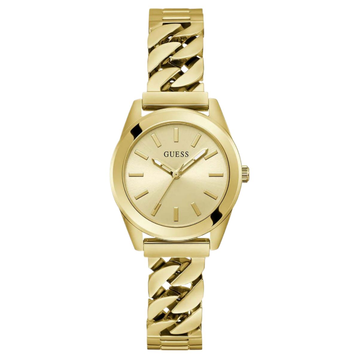 O destaque está na pulseira: em aço inoxidável dourado, ela traz elos largos no estilo corrente, reforçando a identidade ousada e marcante da Guess, além de proporcionar conforto e firmeza no uso.