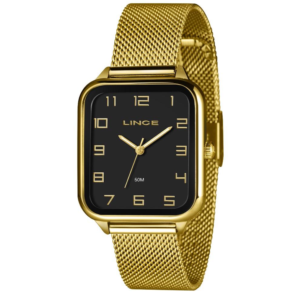 O Relógio Lince Feminino MQGH248L34 P2KX traz um design moderno e sofisticado, com caixa quadrada em metal dourado de 34mm e mostrador preto de fácil leitura. Sua pulseira de aço mesh dourada garante conforto, estilo e ajuste perfeito ao pulso.