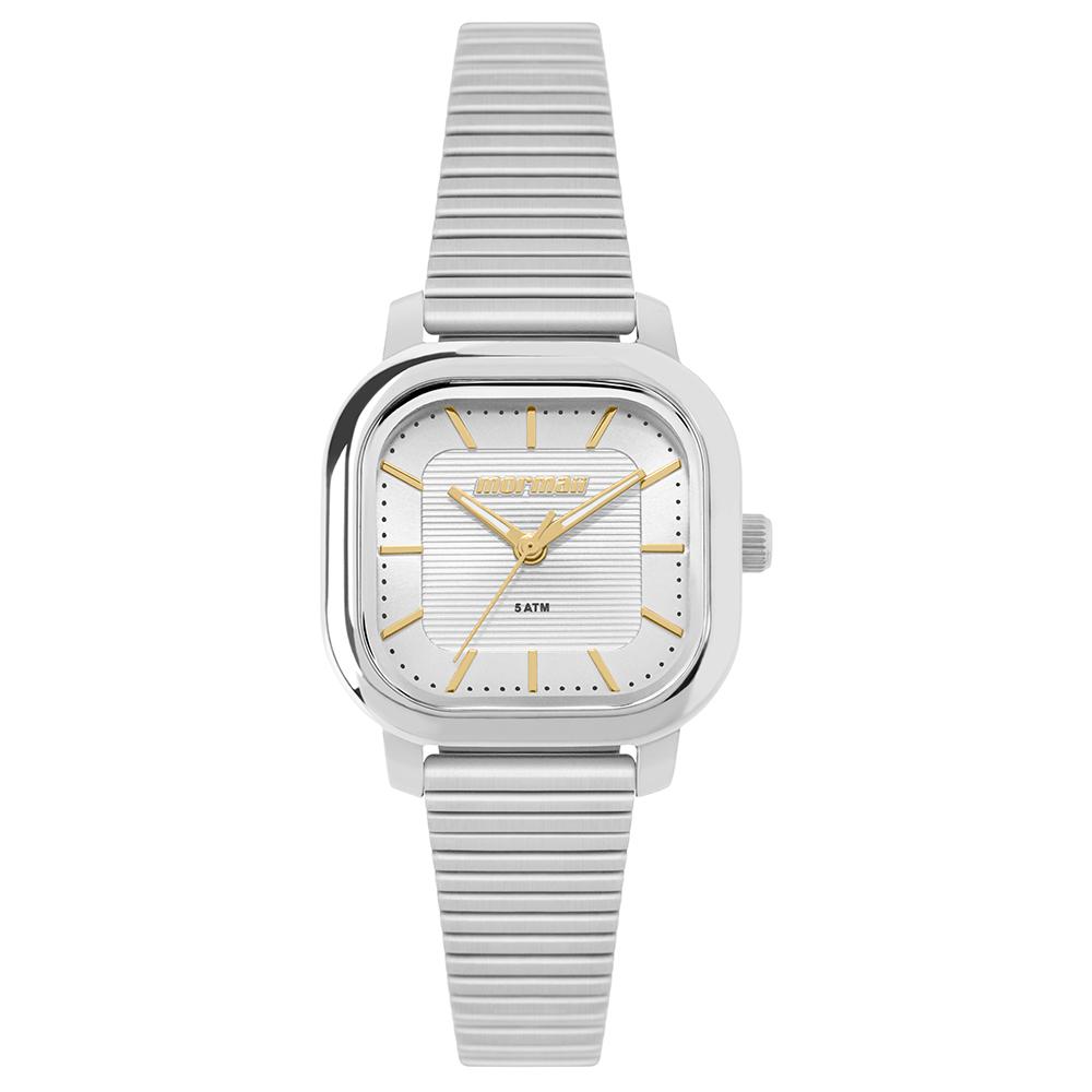 Com caixa em aço inoxidável e pulseira flexível metálica prateada, o relógio oferece conforto e praticidade no uso diário, ajustando-se facilmente ao pulso sem necessidade de fecho. O mostrador prateado apresenta textura em linhas horizontais e detalhes dourados nos marcadores e ponteiros, criando um contraste delicado e sofisticado.