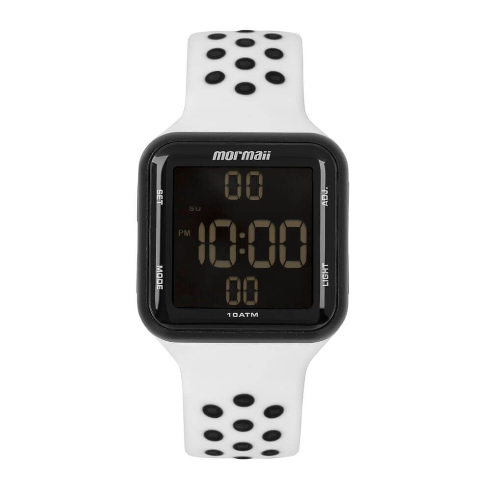 Esses modelos digitais com LCD negativo, resistência de 5ATM e caixa quadrada de 38mm, chegaram com tudo! Com banho preto e pulseira de silicone branca, esse relógio é perfeito para você sair e aproveitar as funcionalidades Mormaii!