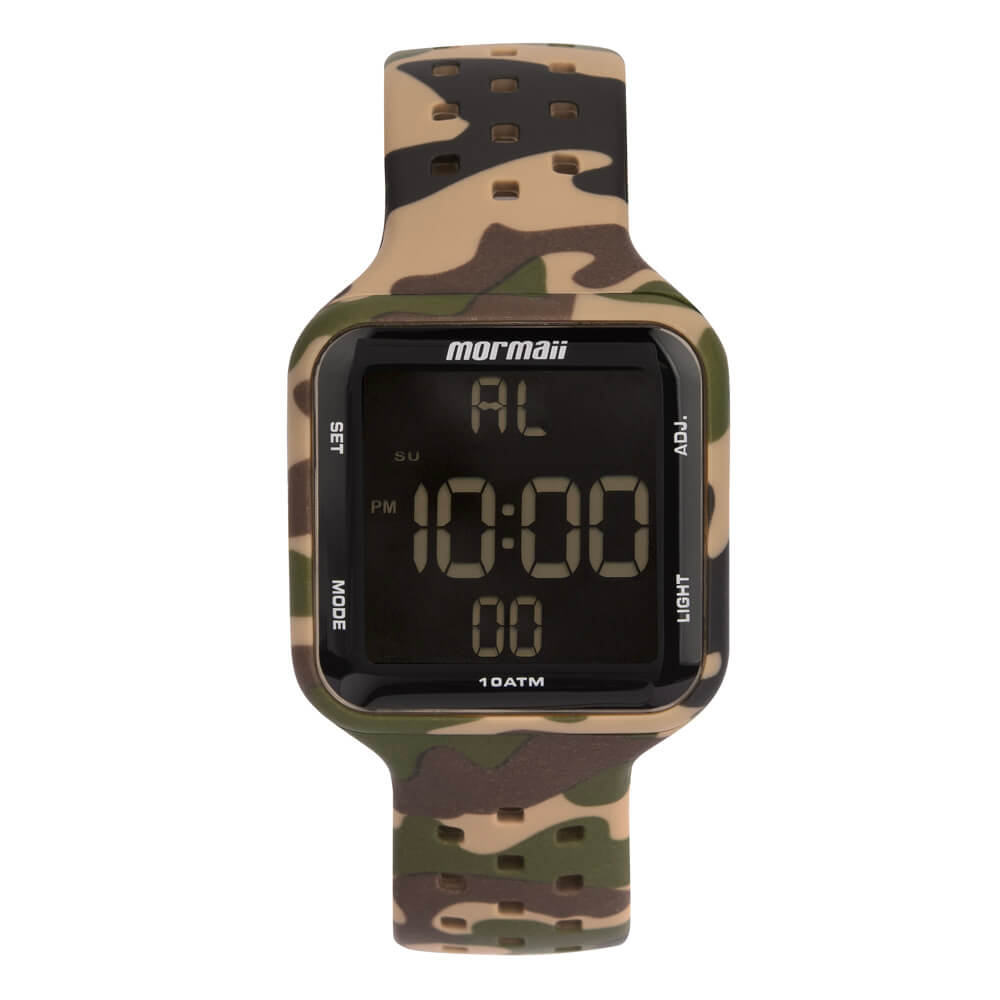 Os modelos Digi da Mormaii são queridos por todos. Com caixa quadrada tamanho 38mm e resistência à água de 100 metros, essa versão conta com pulseira de silicone e modúlo LCD positivo. O grande diferencial está na aplicação da tendência atemporal do camuflado na caixa e na pulseira que foi inspirada nas cores das fardas militares em tons terrosos