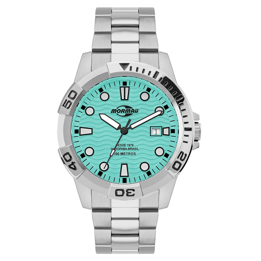 O Relógio Mormaii Masculino MO2317AN/1H apresenta um visual esportivo marcante, inspirado no universo do mergulho e no lifestyle praiano. Seu mostrador em tom verde água com textura ondulada remete diretamente ao mar, trazendo identidade e personalidade ao modelo.