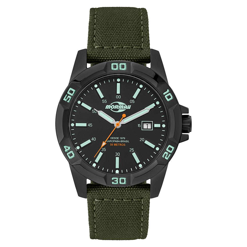 A caixa de 43,5 mm com acabamento preto fosco traz imponência e durabilidade, enquanto o mostrador preto com ponteiros e marcadores luminescentes garante excelente legibilidade, mesmo em ambientes com pouca luz. A pulseira em nylon verde oferece conforto e resistência, acompanhando o ritmo de quem está sempre em movimento.