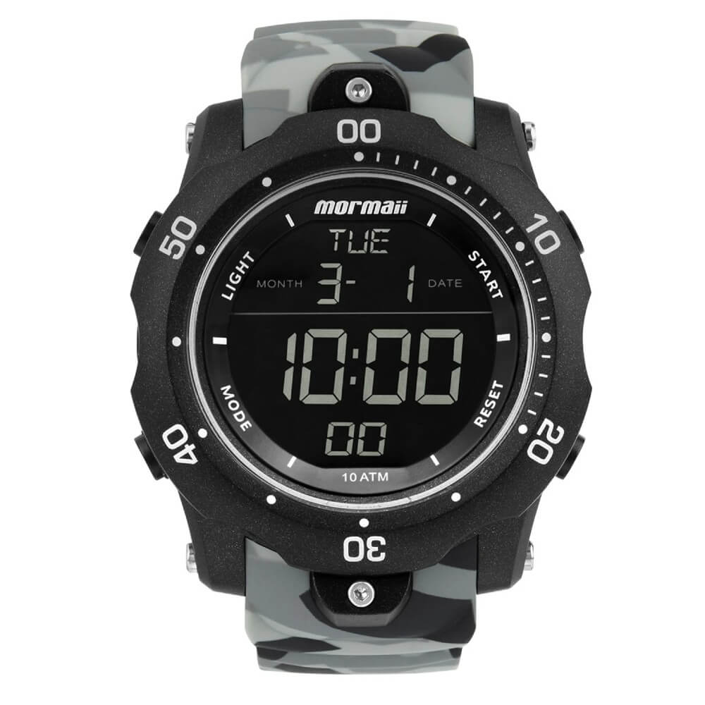 Relógio Mormaii Urban, com pulseira de silicone camuflada, detalhes de parafuso no aro e maquinismo digital. Ele foi feito para quem vive em busca de aventura nos centros urbanos. Possui caixa de polímero, com 52mm, e resistência de 100 metros, além das funções contador de passos, calendário, cronógrafo, cronômetro, dual time e luz noturna para ambientes escuros