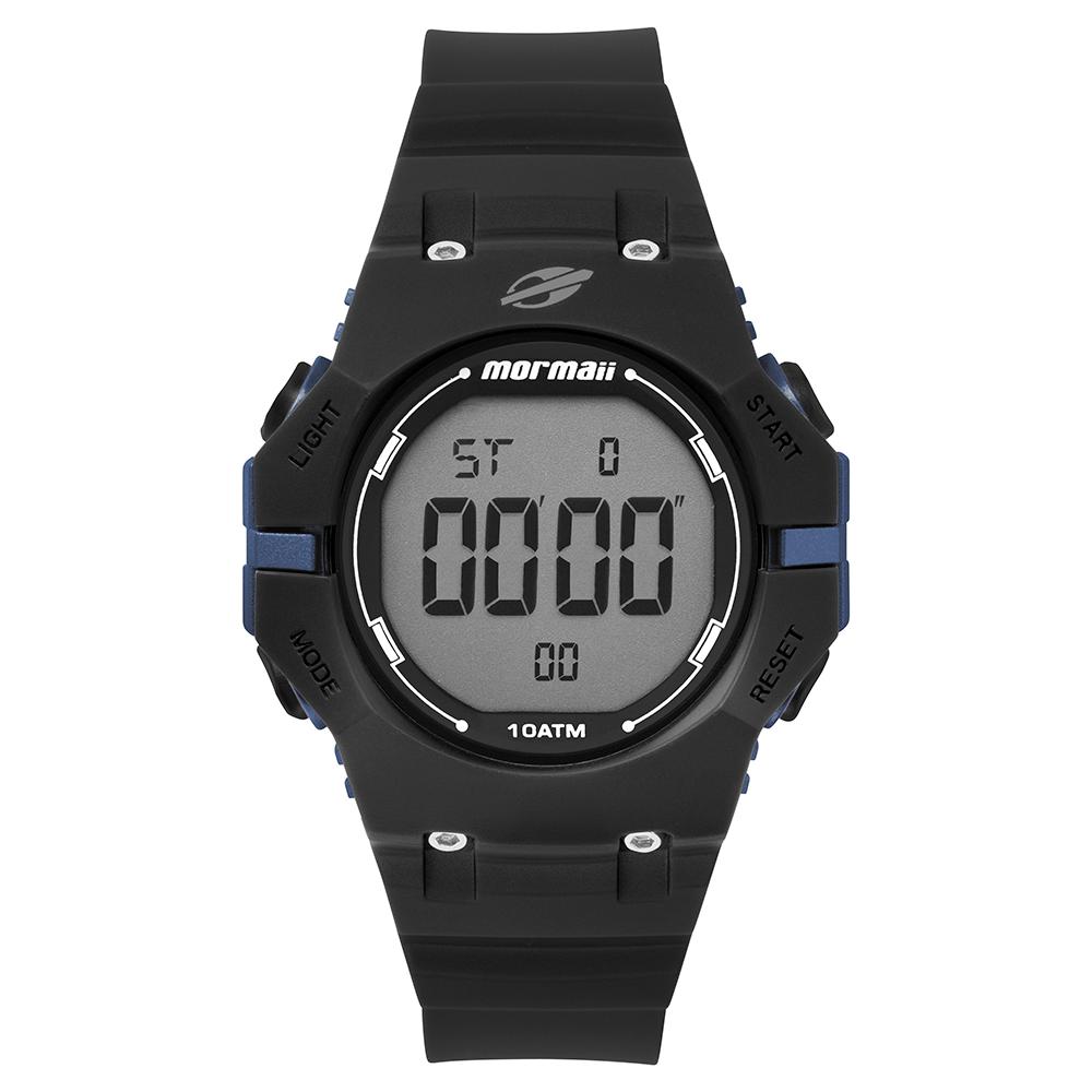 Com caixa em resina preta de 46mm e detalhes em azul, o modelo traz um visual dinâmico e contemporâneo. Seu visor digital de alta legibilidade exibe informações de forma clara, enquanto a pulseira em borracha superconfortável garante ajuste anatômico e durabilidade superior.