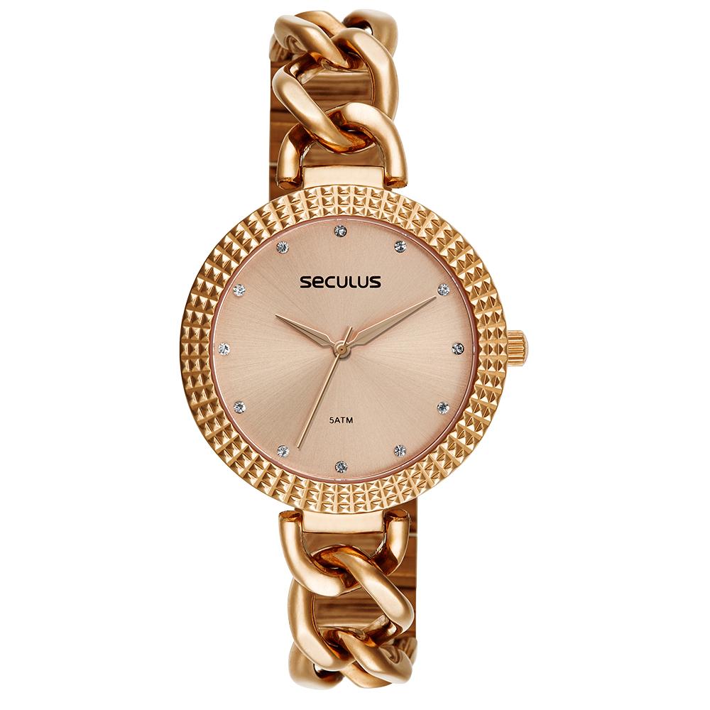 O Relógio Seculus 44257LPSVRB2 é um modelo que combina sofisticação e ousadia, ideal para mulheres que buscam um acessório moderno e elegante. Sua caixa em aço rosé com aro texturizado em relevo traz brilho e exclusividade ao design, tornando-o uma peça de destaque no pulso.