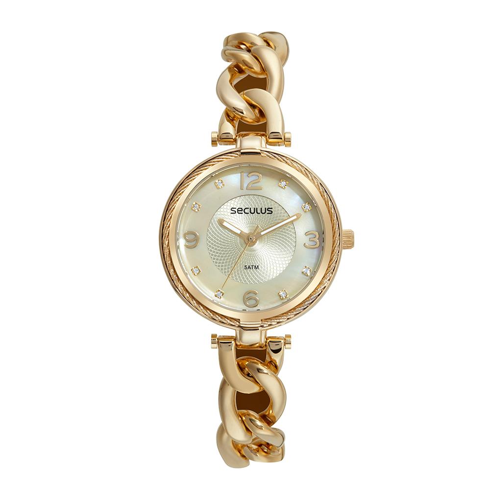 O Relógio Seculus 77231LPSVDS1 é a escolha perfeita para mulheres que buscam sofisticação e delicadeza em um acessório. Sua caixa em aço dourado com acabamento refinado traz imponência na medida certa, enquanto o mostrador madrepérola em tom claro com marcadores em cristais garante elegância e brilho discreto.