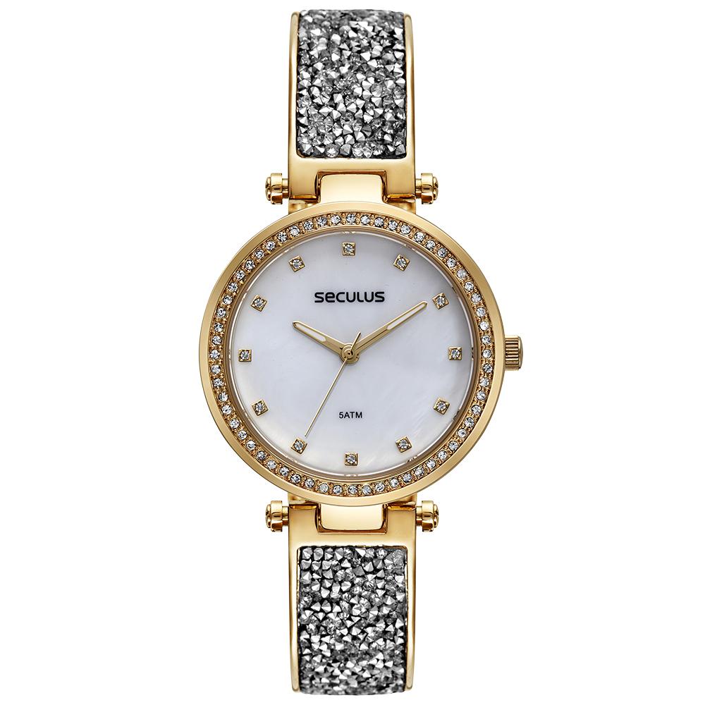 O Relógio Seculus 77276LPSVDB1 é puro glamour em cada detalhe. Sua caixa em aço dourado com aro cravejado em cristais traz sofisticação, enquanto o mostrador em madrepérola oferece um toque delicado e refinado. O grande destaque fica por conta da pulseira em aço com acabamento texturizado e aplicações de cristais, que garantem brilho e personalidade ao acessório.