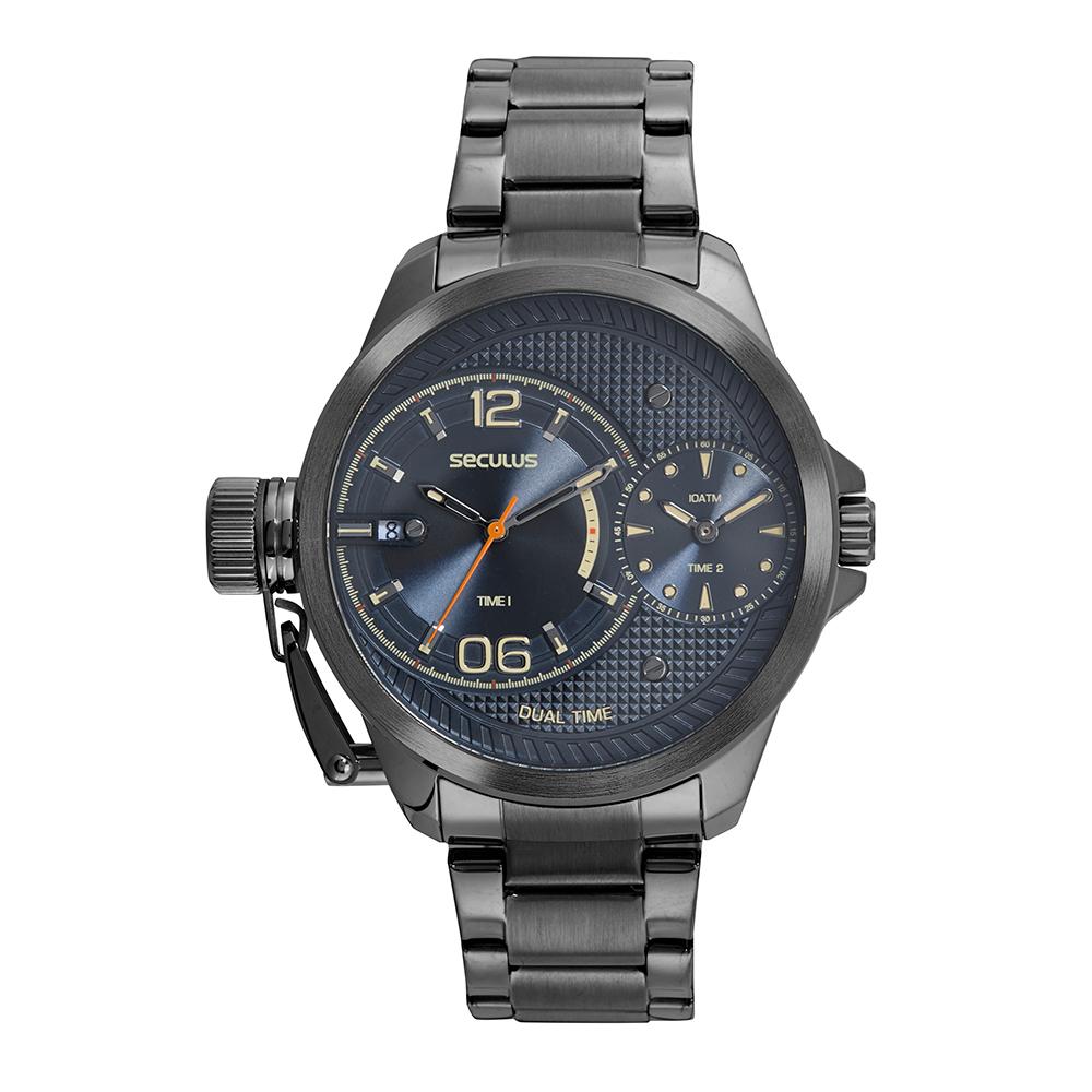 O Relógio Seculus 77220GPSVSA2 é imponente e cheio de personalidade, desenvolvido para homens que buscam estilo marcante e funcionalidade no dia a dia. Sua caixa robusta em aço grafite com 50 mm transmite força e modernidade, enquanto o mostrador azul texturizado agrega sofisticação ao design.