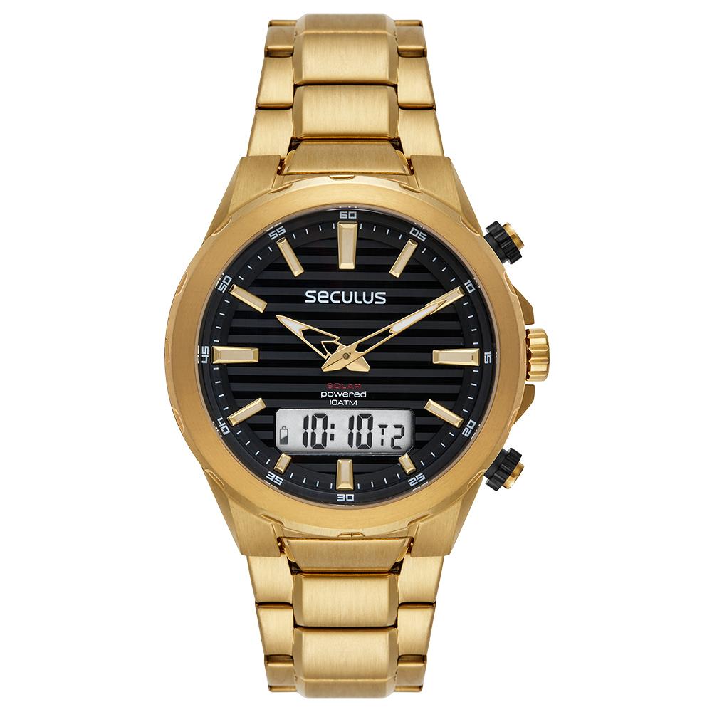 A caixa e a pulseira em aço dourado conferem um visual robusto e elegante, enquanto o mostrador preto com textura horizontal e índices dourados reforçam o contraste e a legibilidade. O modelo conta com alimentação solar, oferecendo maior autonomia e praticidade, além de reduzir a necessidade de trocas frequentes de bateria.