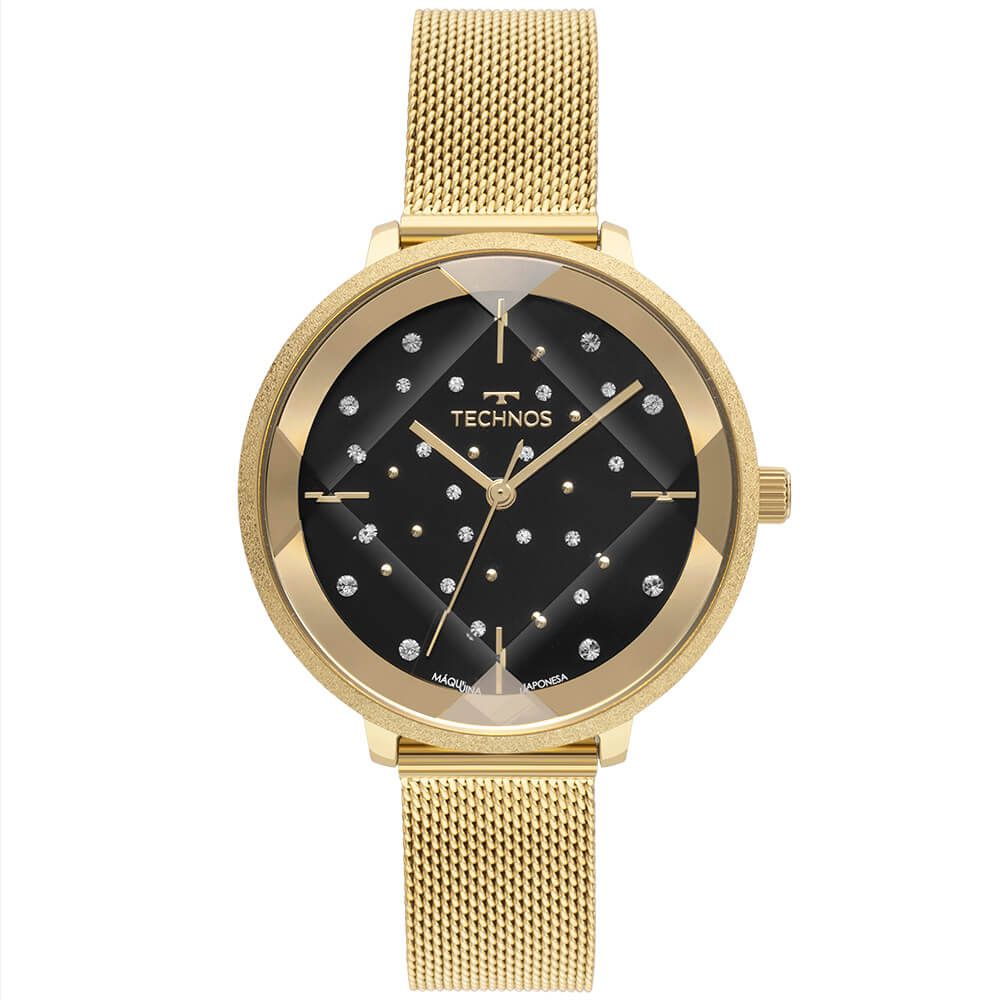 Com aplicação de cristais e detalhes de brilho no mostrador, o novo Technos Crystal, em banho dourado com mostrador preto, apresenta aro trabalhado com textura diferenciada, pulseira mesh de aço e vidro facetado com detalhe de brilho, que reflete ainda mais a luz. Produtos 100% em aço inoxidável, com máquina quartz japonesa e resistência à água de 50m.