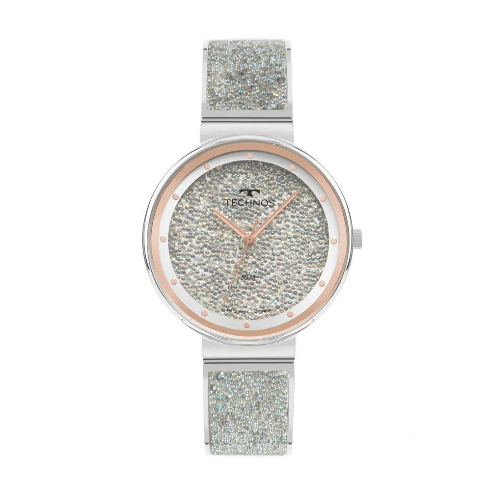 Relógio Technos Crystal com estética diferenciada, inspirada no design único das joias. O modelo conta com a extraordinária aplicação de malha de cristais austríacos no mostrador e em sua inédita pulseira, além dos detalhes em rosé e delicada marcação de horas no aro interno. Produto 100% em aço inoxidável, com máquina quartz Japonesa Miyota e resistência à água de 50m. Tamanho de caixa 36mm