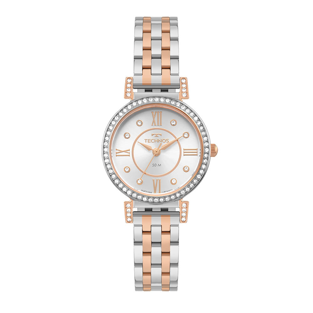 Relógio Boutique apresenta um novo lançamento clássico. Apresenta aplicação de pedras no aro externo e interno, e no mostrador de fácil leitura na cor prata, que conta com numeração romana nos marcadores de hora. Produto 100% em aço inoxidável, banhado em bicolor, com máquina quartz Japonesa Miyota e resistência à água de 50 metros.
