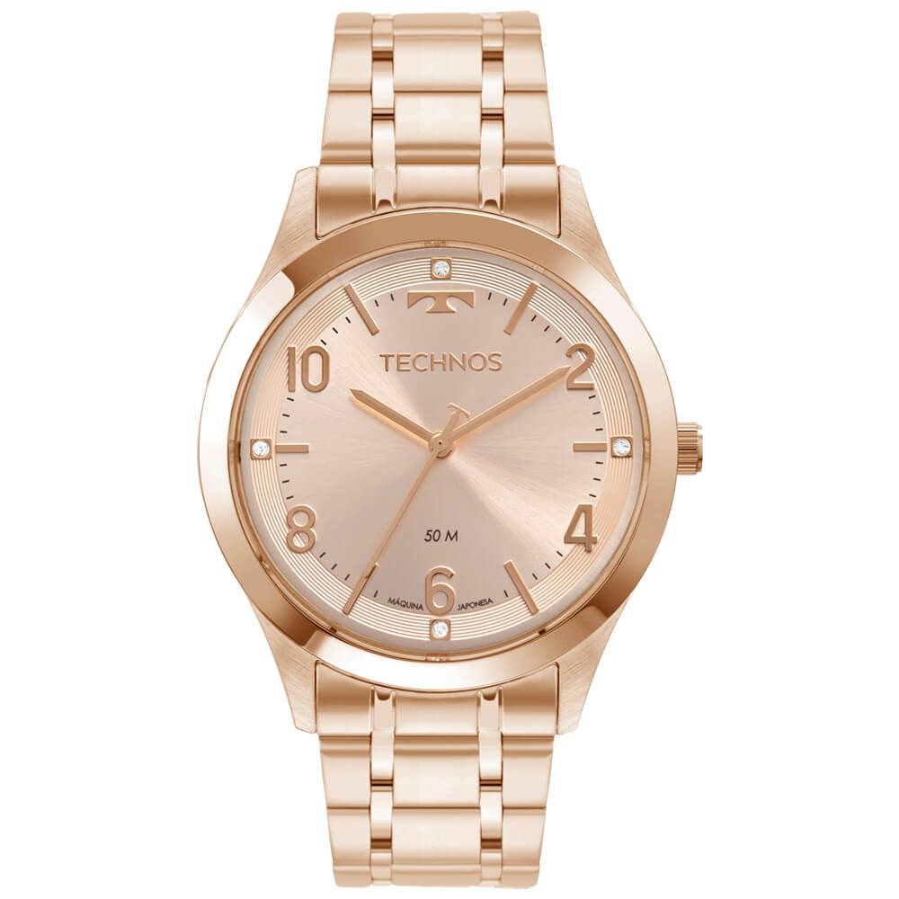 Relógio Technos feminino com caixa e pulseira de aço rosé. Seu mostrador de fácil leitura com aplicação de pedras dão um ar moderno e sofisticado ao modelo. Resistente à água em até 50 metros.