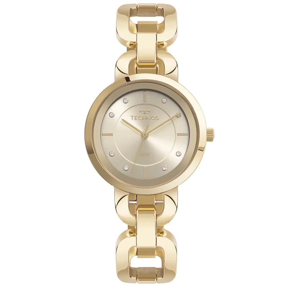 Relógio Technos Elos com traços marcantes e surpreendentes. Sua pulseira de elos em aço inoxidável sólido, todo polido, oferece um design único, e traz a estética do universo das joias para o modelo, que ainda conta com aplicação de pedras delicadas nos marcadores de hora. Produto 100% em aço inoxidável, com banho dourado, máquina quartz Japonesa Miyota e resistência à água de 50m. Tamanho de caixa 34mm.