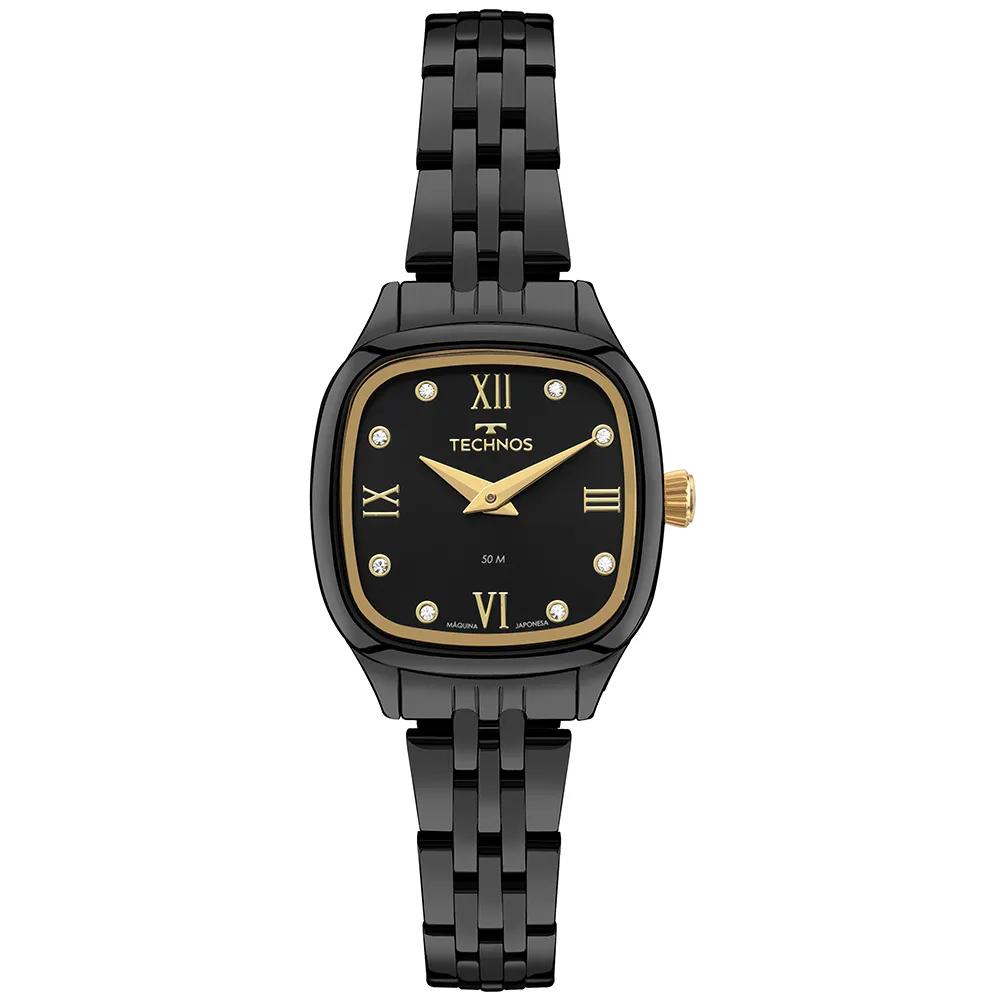 O Relógio Technos Feminino Mini 2025LUO/1P une sofisticação e modernidade em um design marcante. Sua caixa quadrada arredondada em aço preto recebe detalhes dourados, criando um contraste elegante e refinado. O mostrador preto traz marcadores em algarismos romanos e cristais, que garantem brilho e um toque luxuoso ao acessório.