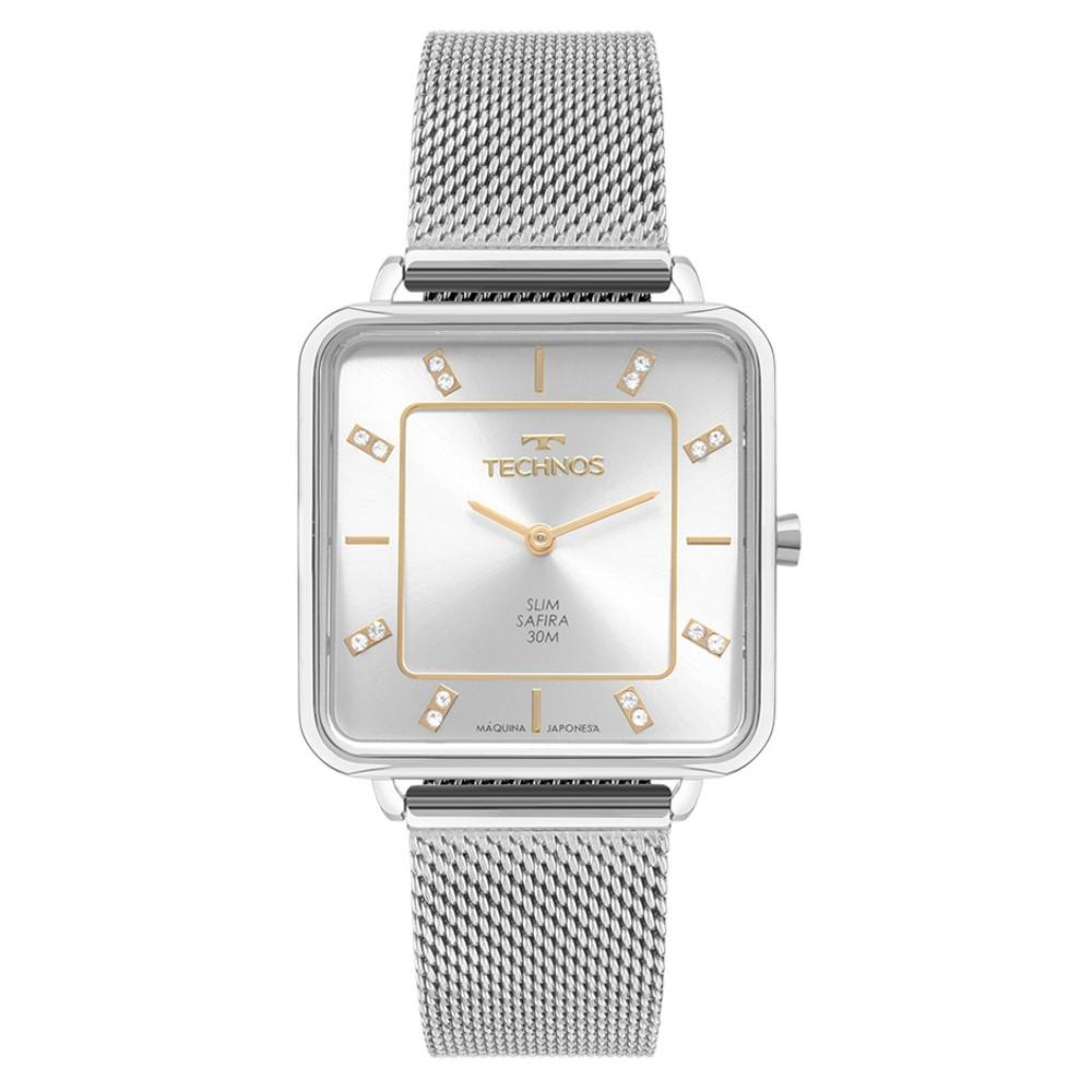 Relógio Technos Slim feminino, com design elegante e caixa quadrada. Seu diferencial está na construção da caixa, fina e sofisticada, e em seu mostrador minimalista, com aplicação de pedras nos marcadores de hora e assinatura de linha. Com pulseira de mesh e vidro de safira, é um relógio que, além de ser leve e confortável em qualquer pulso, entrega alta resistência a riscos e arranhões. Produto 100% em aço inoxidável, com máquina quartz japonesa Miyota e resistência à água de 50m. Tamanho de caixa 32mm