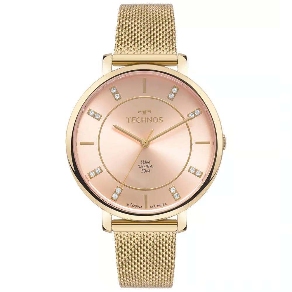 Relógio Technos Slim feminino, com design elegante. Seu diferencial está na construção da caixa, fina e sofisticada, e em seu mostrador minimalista de cor rosé, com aplicação de pedras nos marcadores de hora e assinatura de linha. Com pulseira de mesh e vidro de safira, é um relógio que, além de ser leve e confortável em qualquer pulso, entrega alta resistência a riscos e arranhões. Produto 100% em aço inoxidável em banho dourado, com máquina quartz japonesa Miyota e resistência à água de 50m. Tamanho de caixa 38mm