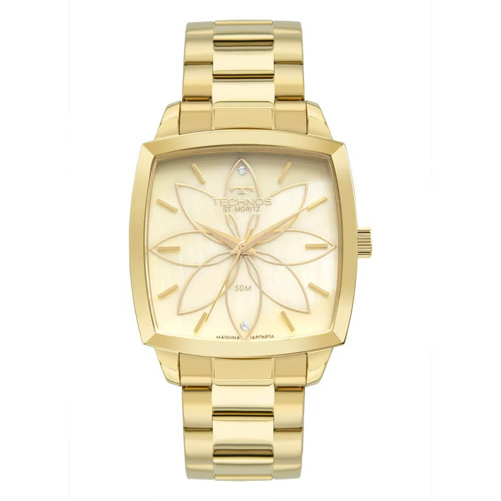 Relógio Technos St. Moritz feminino, com caixa e pulseira de aço inoxidável em banho dourado. O modelo apresenta aplicação de madre-pérola e pedras em seu mostrador, além de um delicado contorno dourado em forma de flor. Possui caixa quadrada, máquina quartz japonesa e resistência à água de até 5 ATM