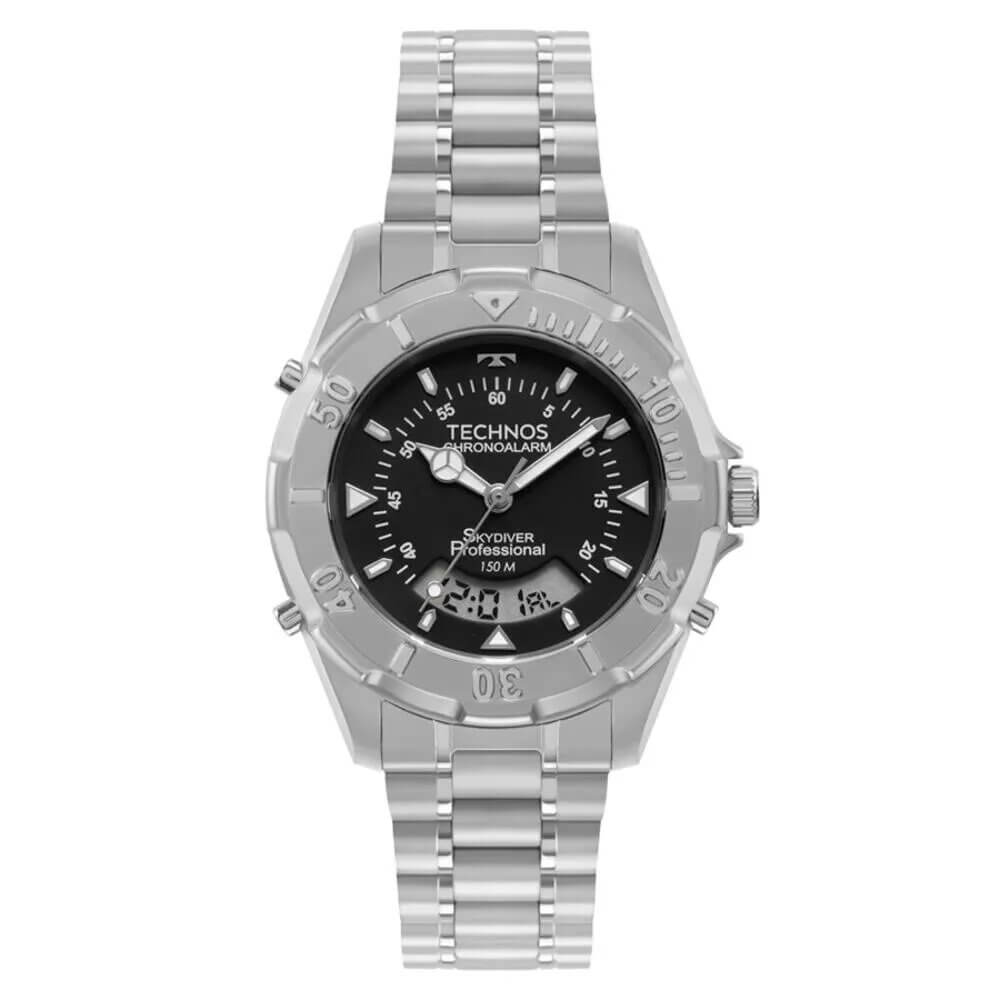 Relógio Technos Skydiver, um modelo icônico da marca. Com caixa e pulseira de aço inox, ele apresenta características inconfundíveis, como o seu maquinismo anadigi, display digital em formato de sorriso e mostrador com lumi. Possui aro giratório, mostrador na cor branca e resistência à água de até 15 ATM