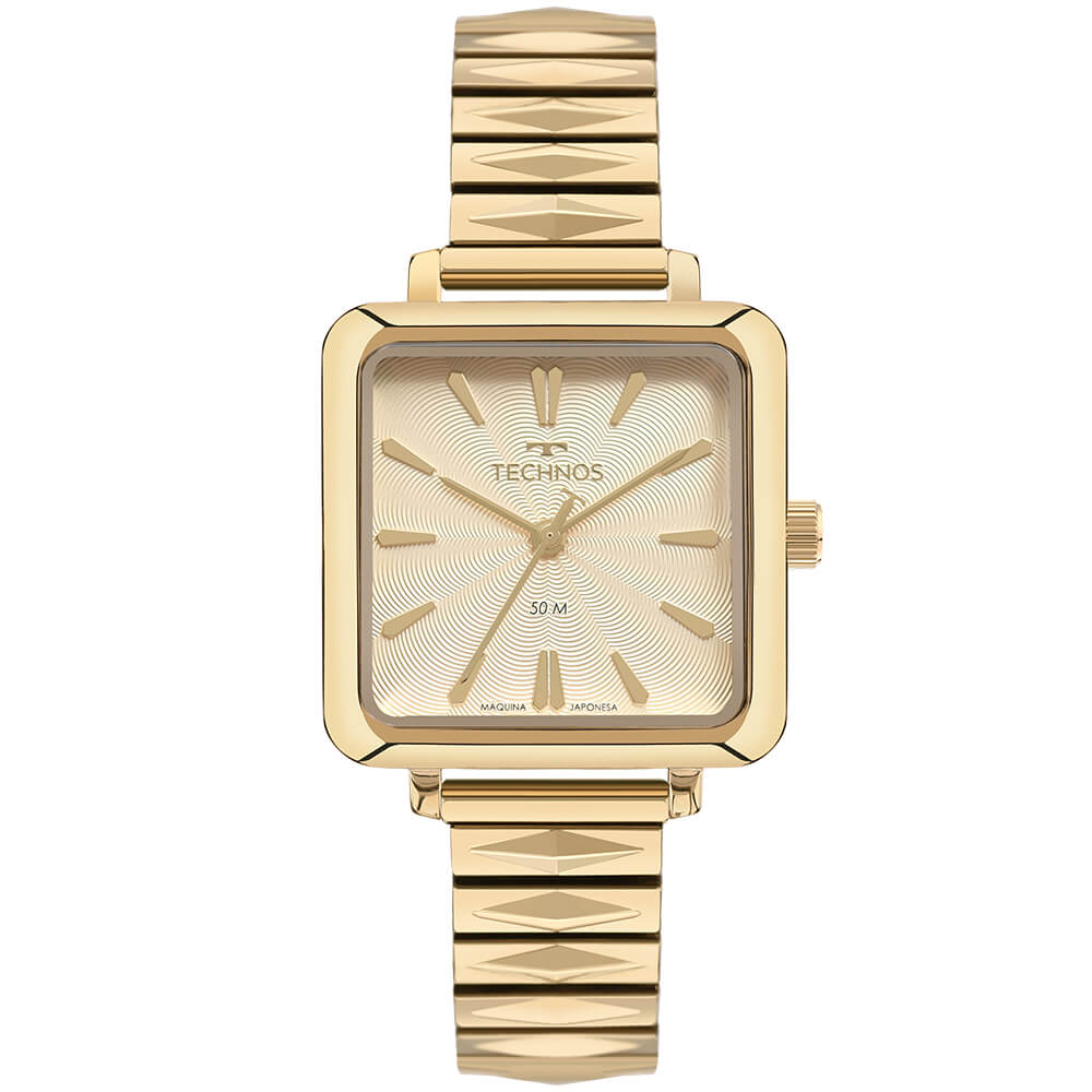 Relógio Technos Style com design moderno e caixa quadrada; elegante pulseira de mola diferenciada, mostrador com aplicação de textura sutil e marcadores de hora no formato de pipa. Produto 100% em aço inoxidável em banho dourado, com máquina quartz japonesa Miyota e resistência à água de 50m. Tamanho de caixa 33mm.